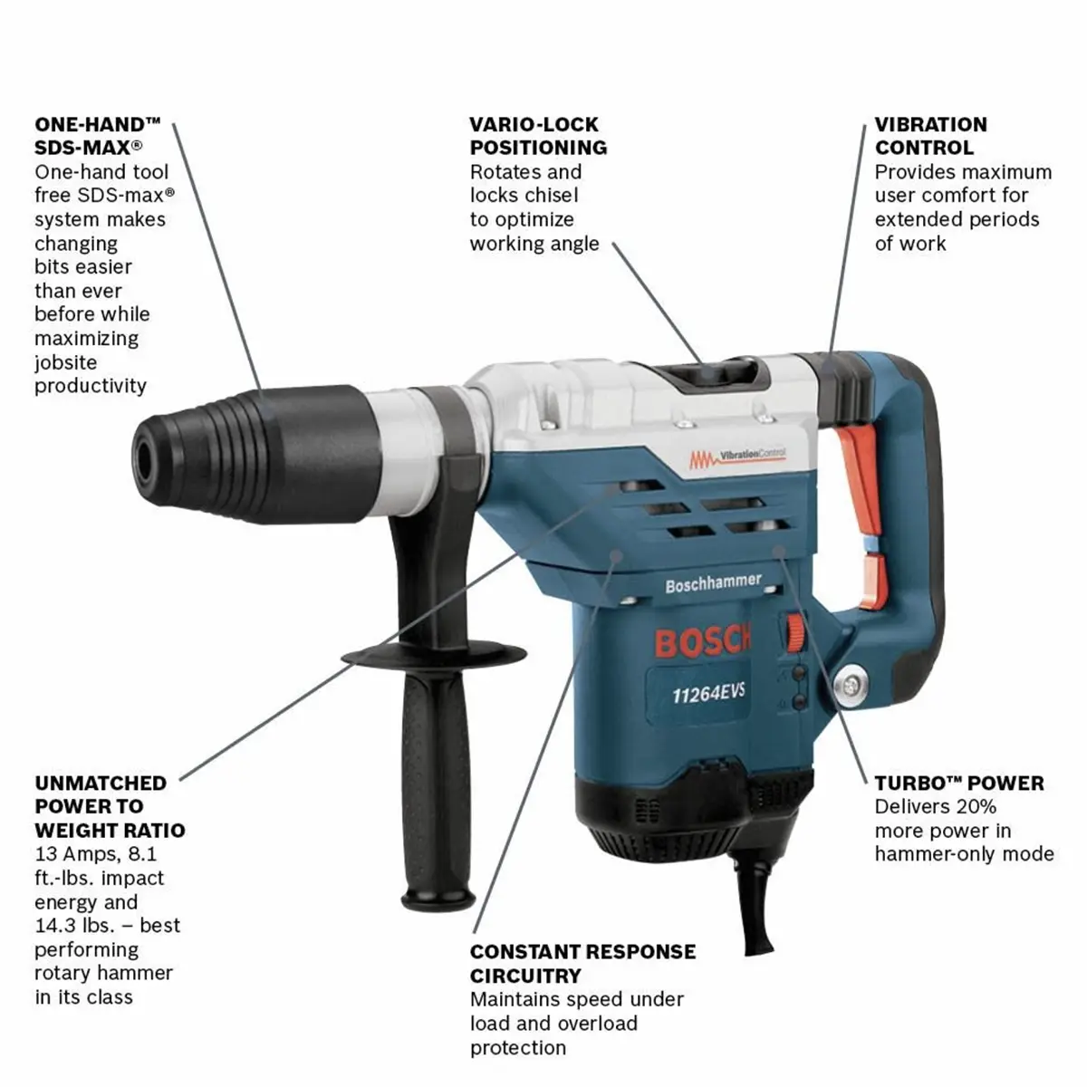 The combination of Turbo Power, Constant Response circuitry, and Active Vibration Control ensures efficient drilling and chiseling performance even during extended use. These features help maintain consistent productivity on demanding jobsites.