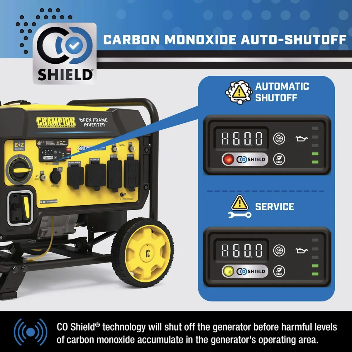 - CO Shield automatically shuts down the generator if carbon monoxide levels rise