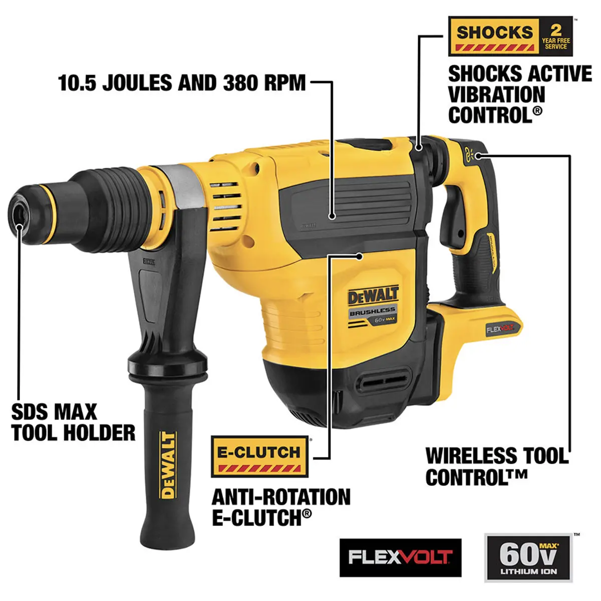The DeWalt 60V 1-3/4 SDS Max Combination Hammer integrates advanced safety and comfort technologies such as the E-Clutch system and SHOCKS Active Vibration Control system. These features help reduce user fatigue and automatically stop the rotation of the bit during bind-up situations, improving safety during heavy-duty drilling.