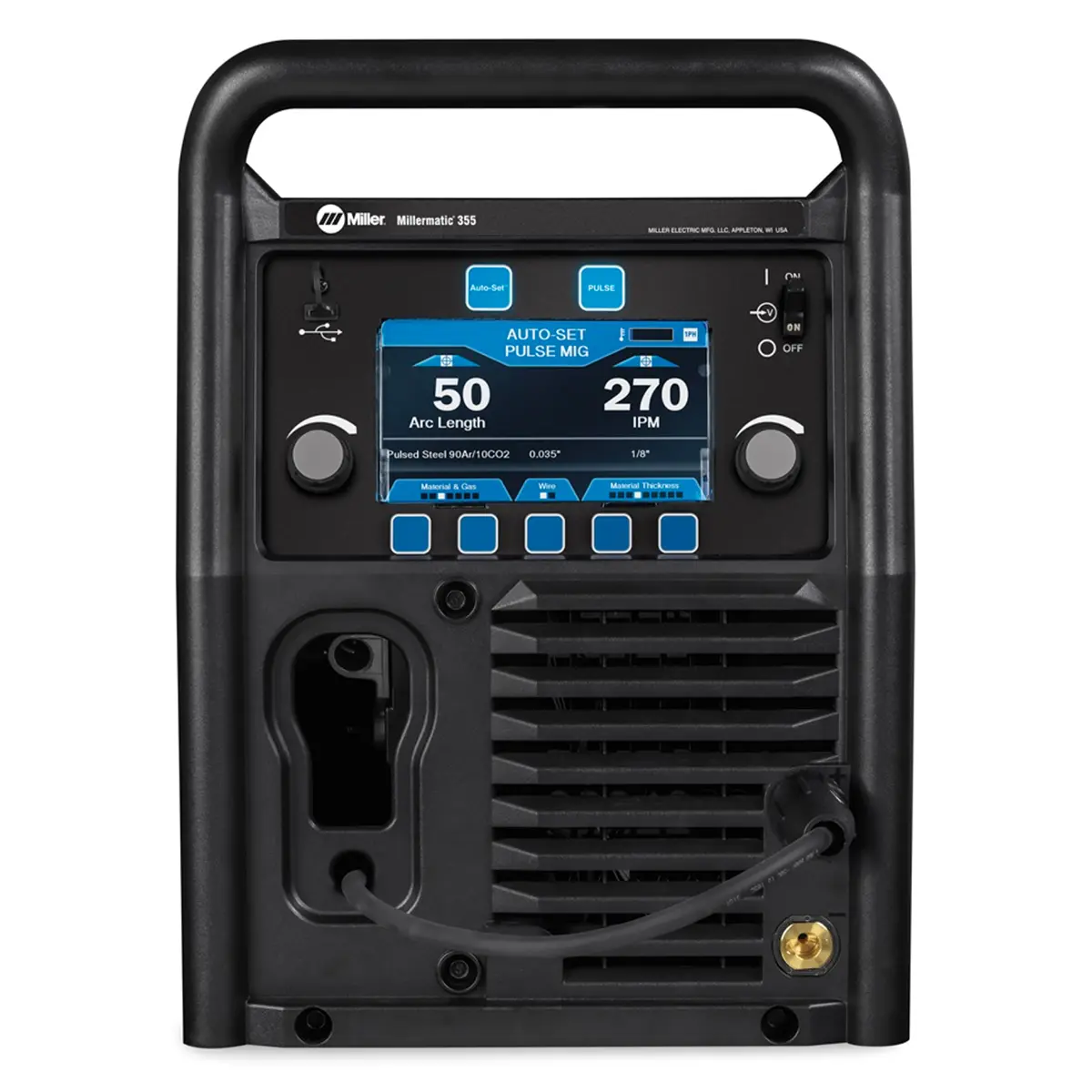 The Miller Electric Millermatic 355 MIG Welder is a high-performance MIG and pulsed MIG welding machine designed for manufacturing, fabrication, and mobile industrial environments. Featuring Auto-Set Elite technology and a 7-inch color LCD interface, this all-in-one welder simplifies setup while delivering precise control for consistent, high-quality welds.