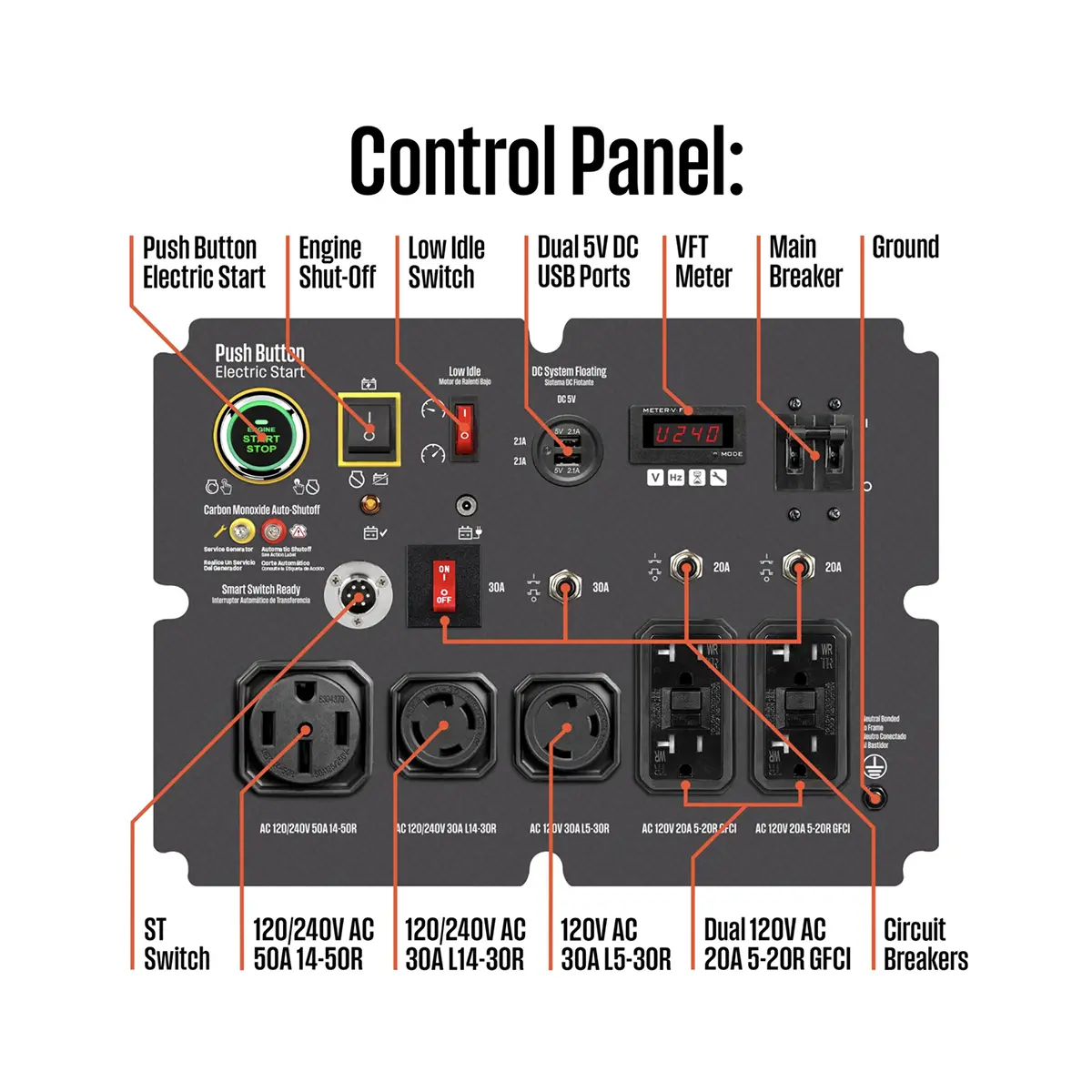 - Transfer switch ready 50A 14-50R and 30A L14-30R outlets for home backup integration
